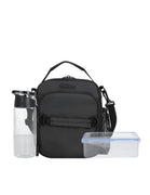 Lonchera de 9L con interior térmico Thermo-Grid que conserva la temperatura. Incluye contenedor para alimentos y botella. Exterior con múltiples asas, bolsillo para botella, correa desmontable, banda para carro y cierre Kissing Lock.