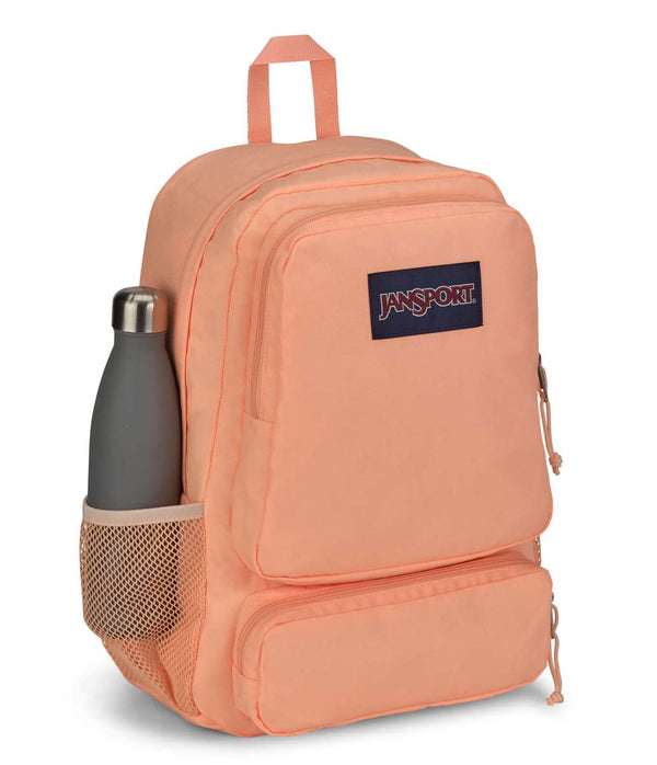 La mocihla Doubletom de Jansport de 27L, tiene un gran compartimento principal, bolsillos laterales dobles para botellas de agua. Funda acolchada para portátil de 15 pulgadas, bolsillo frontal con organizador. Bolsillo inferior con cierre. Correas de homb