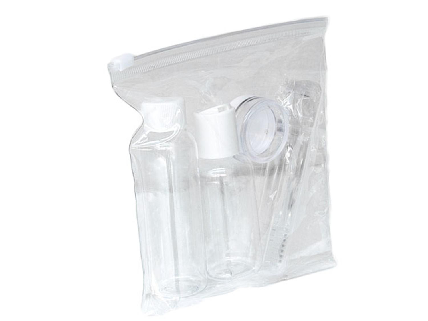 Kit de viaje con estuche de plástico transparente, contiene dos botellitas, cepillo de dientes y un pastillero.